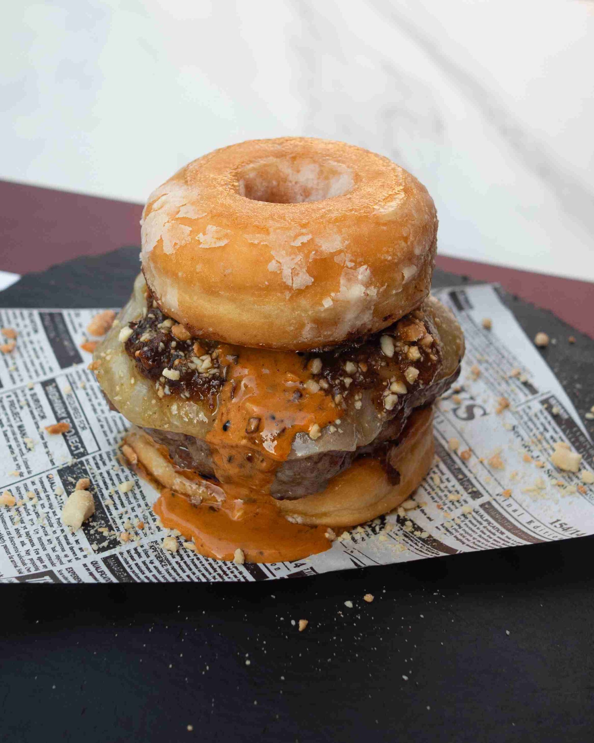 Berlina glaseada y caramelizada, burger vaca madurada 45 días, queso oveja de León, mermelada de bacon, cachuete tostado y mayonesa cítrica (con nuestra salsa blasfema)