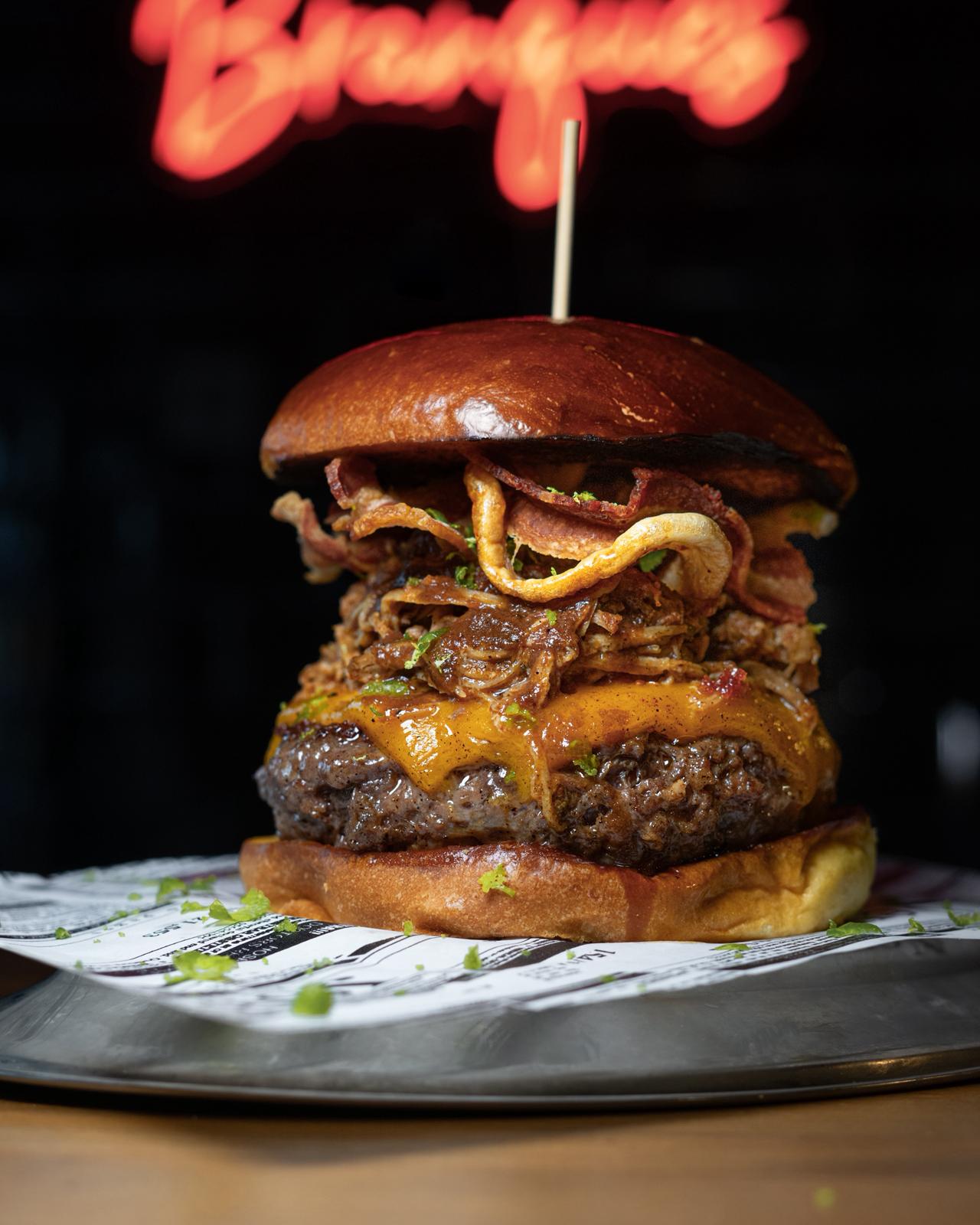 Doble Smash Burger de 90g con cebolla estilo Oklahoma, doble queso cheddar, doble de bacon y salsa Branques.