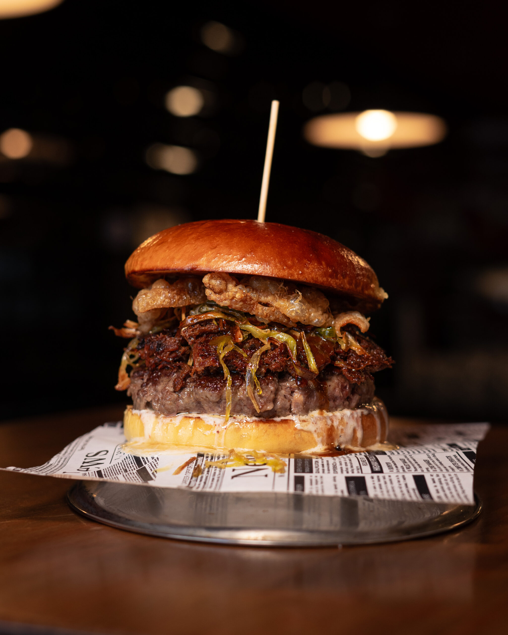 Pan mollete crujiente, piel crujiente confitada con nuestra Hoisin casera, pato desmigado con crocante casero, burger vaca 45 días de maduración, salsa shatziki de crema agría y tajin y puerro caramelizado.