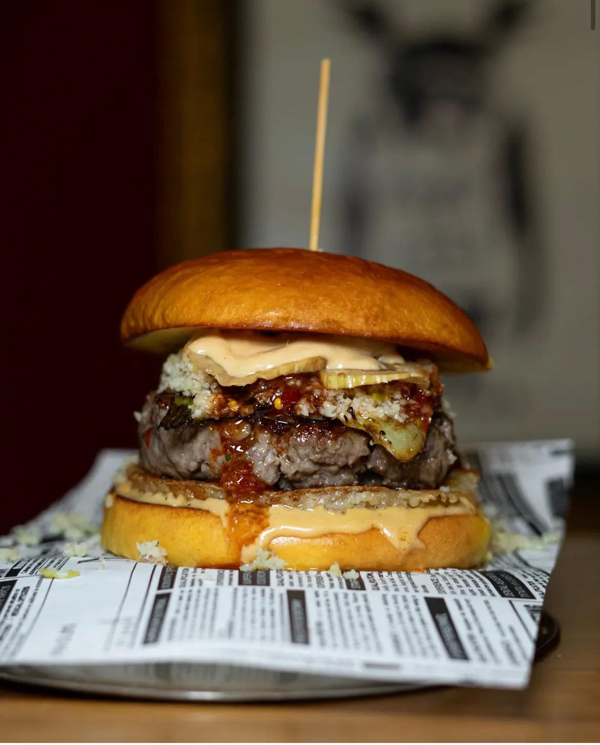 Pan brioche tostado, arroz crujiente presado, burger madurada, salsa satay, pak choy a la brasa, relish suave de coco i lima, salsa sweet chili y pepinillo encurtido.